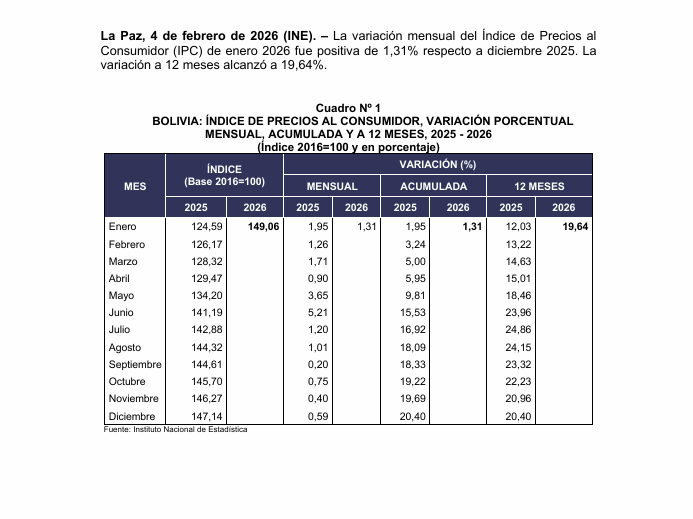 La variación porcentual del IPC del mes de enero de 2026, fue de 1.31%