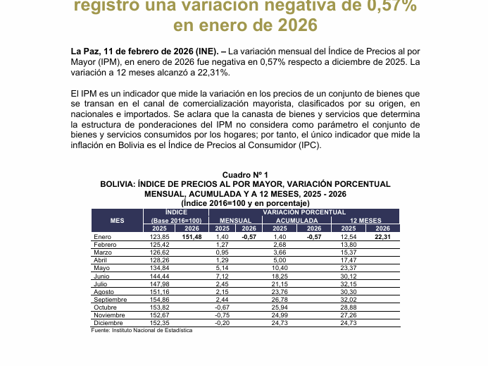La variación porcentual del IPM del mes de enero de 2026, fue de -0.57%