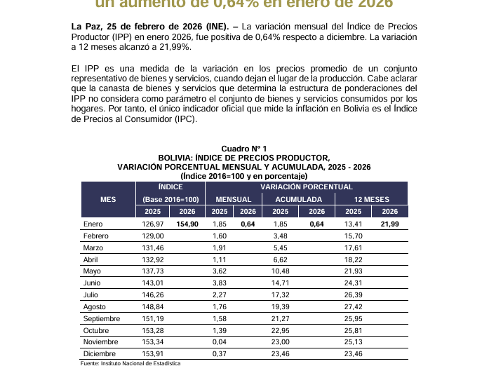 La variación porcentual del IPP del mes de diciembre de 2025, fue de 0.37%