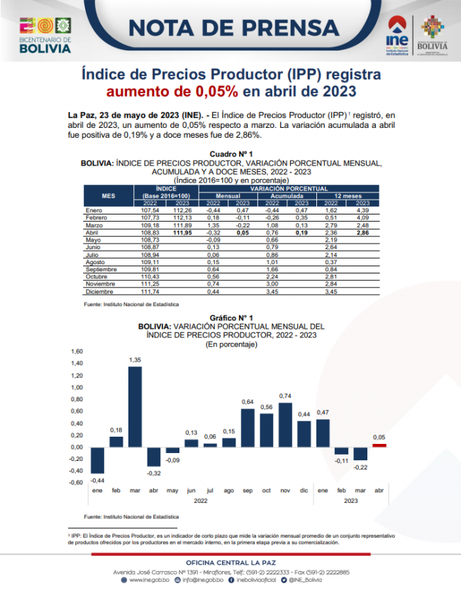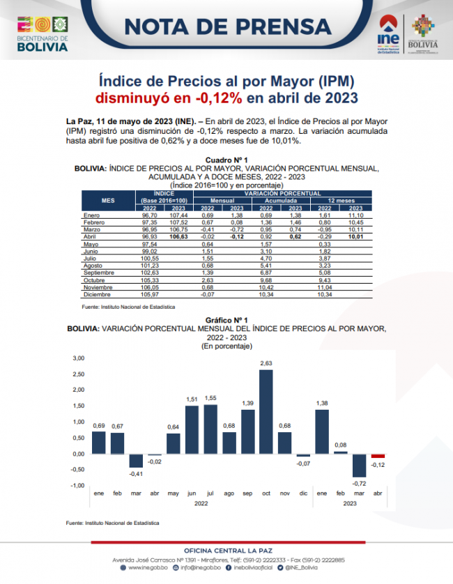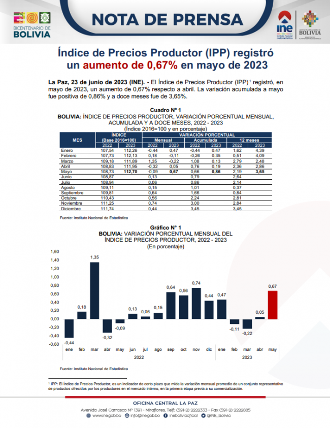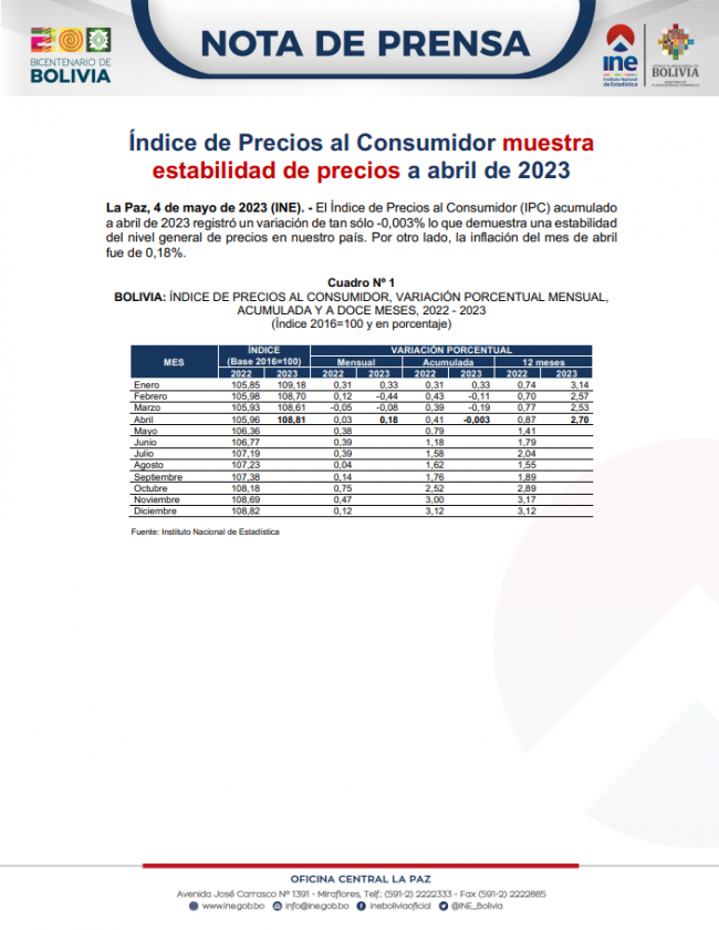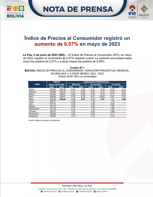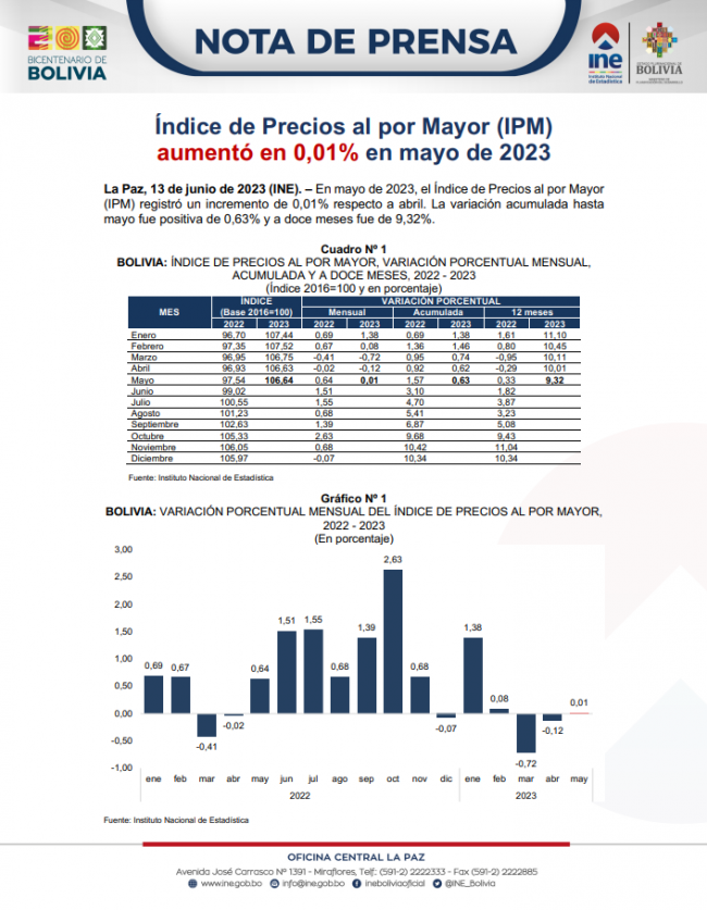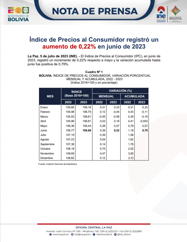 La Paz, 5 de julio de 2023 (INE). – El Índice de Precios al Consumidor (IPC), en junio de 2023, registró un incremento de 0,22% respecto a mayo y la variación acumulada hasta junio fue positiva de 0,79%. Comportamiento de Precios al Consumidor, según divisiones de Bienes y servicios El aumento de 0,22% del…