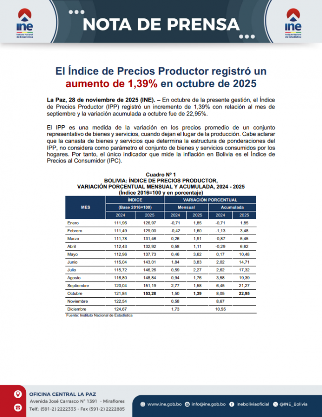 La Paz, 28 de noviembre de 2025 (INE). – En octubre de la presente gestión, el Índice de Precios Productor (IPP) registró un incremento de 1,39% con relación al mes de septiembre y la variación acumulada a octubre fue de 22,95%. El IPP es una medida de la variación en los precios promedio de un…