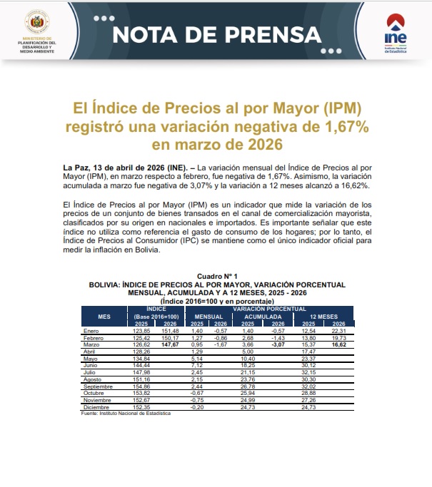 La Paz, 31 de marzo de 2026 (INE).- El Instituto Nacional de Estadística (INE) cumplió de forma parcial las metas previstas para la gestión 2025, en este marco se destacan la actualización de las Cuentas Nacionales y la consolidación de la Encuesta de Demografía y Salud 2023 como fuente estratégica para políticas públicas, informó el…