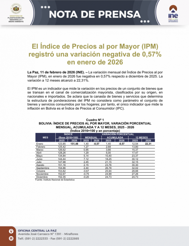 La Paz, 11 de febrero de 2026 (INE). – La variación mensual del Índice de Precios al por Mayor (IPM), en enero de 2026 fue negativa en 0,57% respecto a diciembre de 2025. La variación a 12 meses alcanzó a 22,31%. El IPM es un indicador que mide la variación en los precios de un…