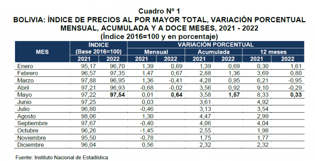 La Paz, 10 de junio de 2022 (INE). – El Índice de Precios al Por Mayor (IPM) registró en mayo de 2022 un aumento de 0,64% respecto al mes anterior. La variación acumulada a mayo fue positiva de 1,57% y a doce meses fue positiva de 0,33%. Comportamiento de Precios al Por Mayor, según origenEl…