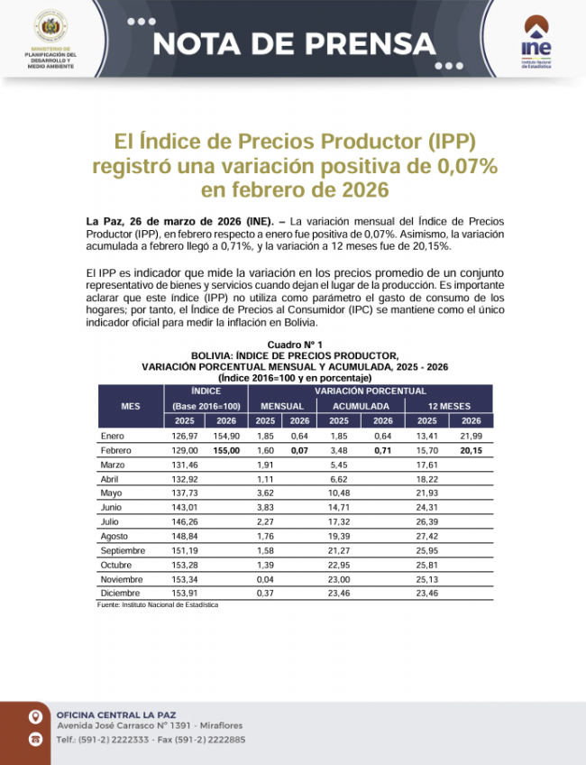 La Paz, 27 de marzo de 2026 (CA).- El Instituto Nacional de Estadística (INE), a través de su Director General Ejecutivo, Jorge Akamine Toledo, sostuvo una reunión estratégica de coordinación con la Presidenta Nacional de la Coordinadora de Integración de Organizaciones Económicas Campesinas de Bolivia (CIOEC-BOLIVIA), Carmen Vargas, en el marco de la planificación del…