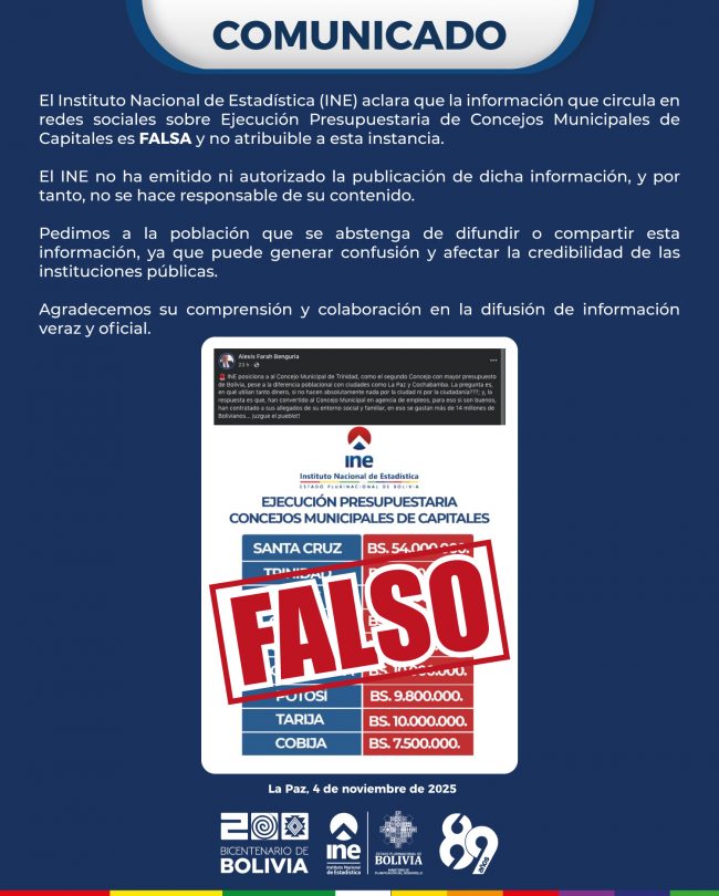 La Paz, 7 de noviembre de 2025 (INE). – El Instituto Nacional de Estadística (INE) pone a disposición en su página web un nuevo sistema informático denominado Infraestructura de Datos Geo estadísticos (IDG) que permitirá contar con datos geo referenciados, definiendo grillas geo estadísticas como cantidad de población, producción agrícola y pecuaria, salud, entre otros…