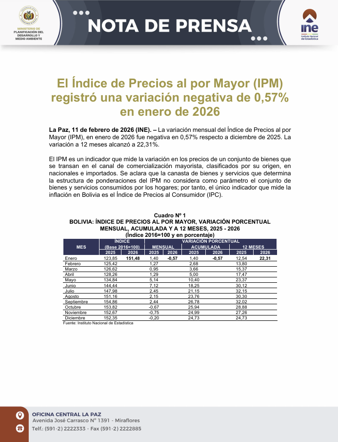 La Paz, 11 de febrero de 2026 (INE). – La variación mensual del Índice de Precios al por Mayor (IPM), en enero de 2026 fue negativa en 0,57% respecto a diciembre de 2025. La variación a 12 meses alcanzó a...