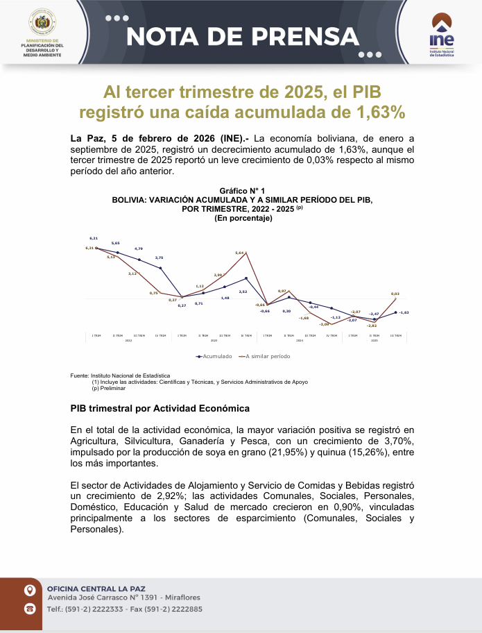 La Paz, 5 de febrero de 2026 (INE).- La economía boliviana, de enero a septiembre de 2025, registró un decrecimiento acumulado de 1,63%, aunque el tercer trimestre de 2025 reportó un leve crecimiento de 0,03% respecto al mismo período del...