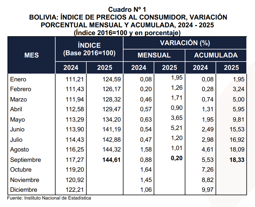 La Paz, 2 de octubre de 2025 (INE). – Luego del impacto adverso de varios fenómenos que afectaron a la oferta productiva como ser bloqueos de origen político, por tercer mes consecutivo la inflación registra una ralentización. En efecto, la variación mensual del Índice de Precios al Consumidor (IPC) de septiembre fue positiva de 0,20% respecto a agosto. La variación acumulada hasta septiembre alcanzó a 18,33%.