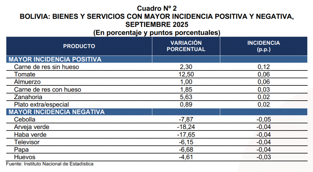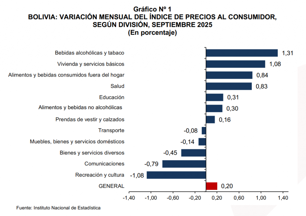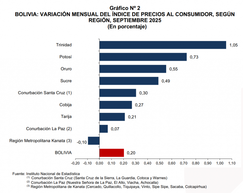 La variación positiva de 0,20%, registrada en septiembre 2025, se explica por el incremento de precios reportado en las ciudades capitales y conurbaciones: Trinidad 1,05%; Potosí 0,73%; Oruro 0,55%; Sucre 0,49%; Conurbación Santa Cruz 0,30%; Cobija 0,27%; Tarija 0,21% y Conurbación La Paz 0,07%.