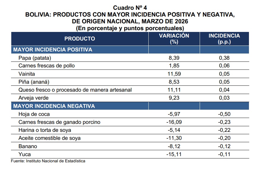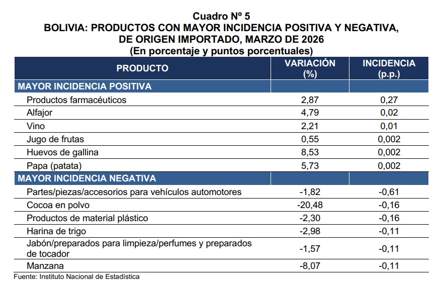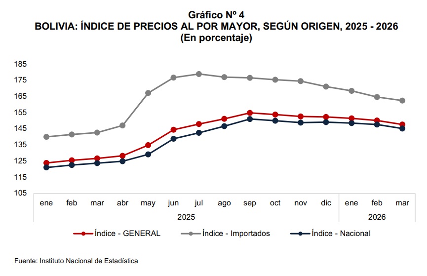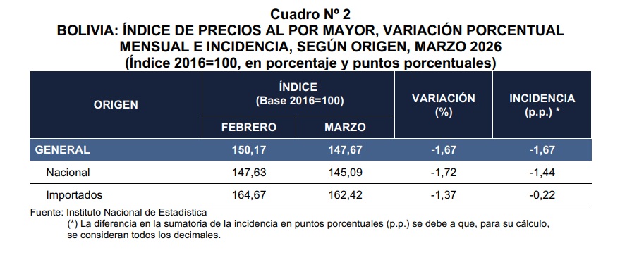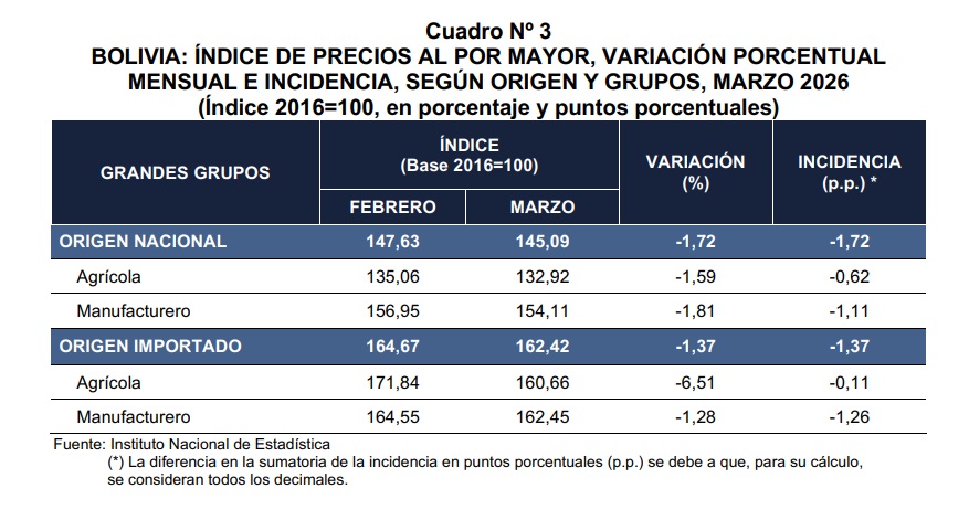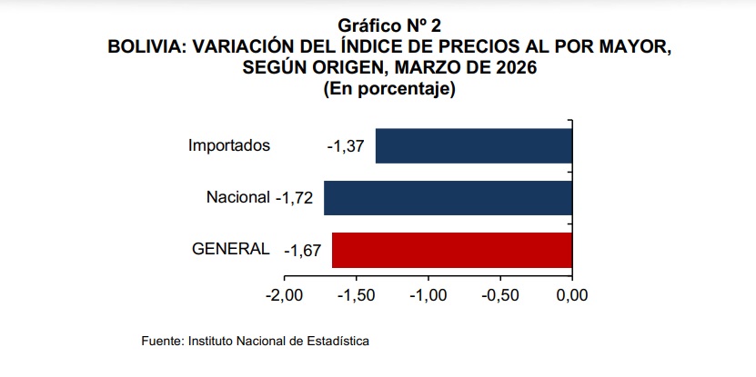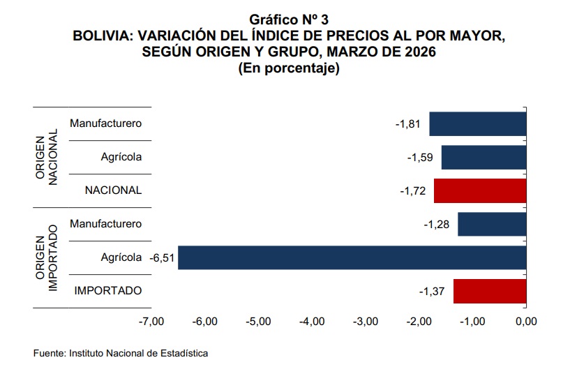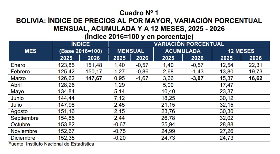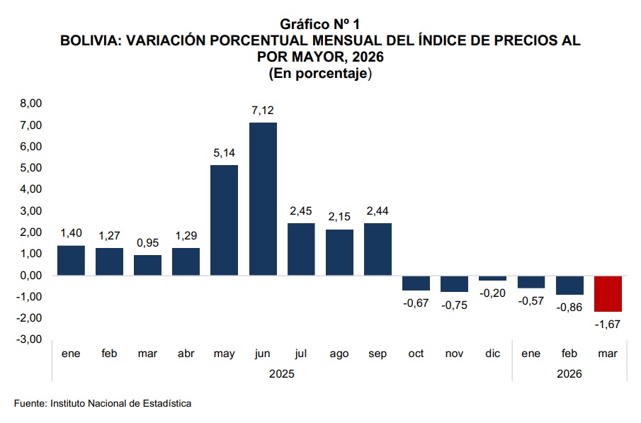 La Paz, 13 de abril de 2026 (INE). – La variación mensual del Índice de Precios al por Mayor (IPM), en marzo respecto a febrero, fue negativa de 1,67%. Asimismo, la variación acumulada a marzo fue negativa de 3,07% y la variación a 12 meses alcanzó a 16,62%.