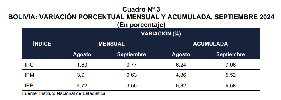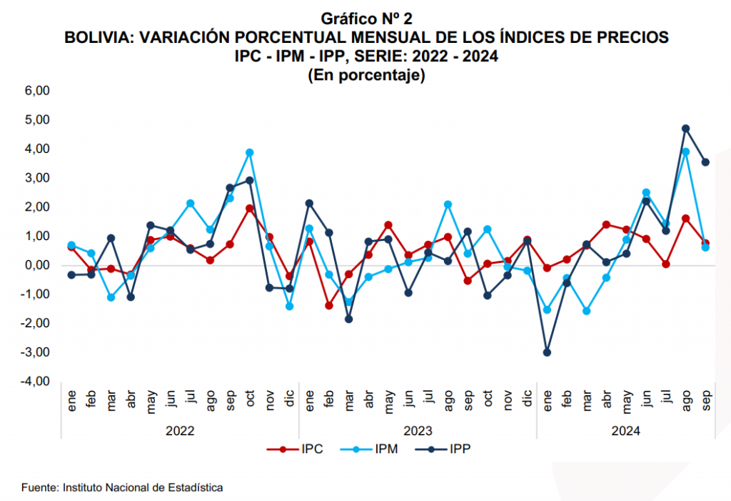 La Paz, 25 de octubre de 2024 (INE). – El Índice de Precios Productor (IPP) registró, en septiembre de 2024, un aumento de 2,77% respecto a agosto y una variación acumulada positiva de 6,45%.