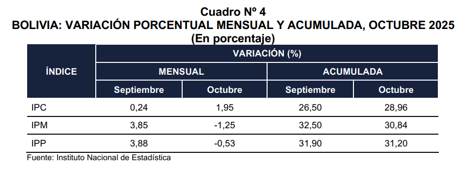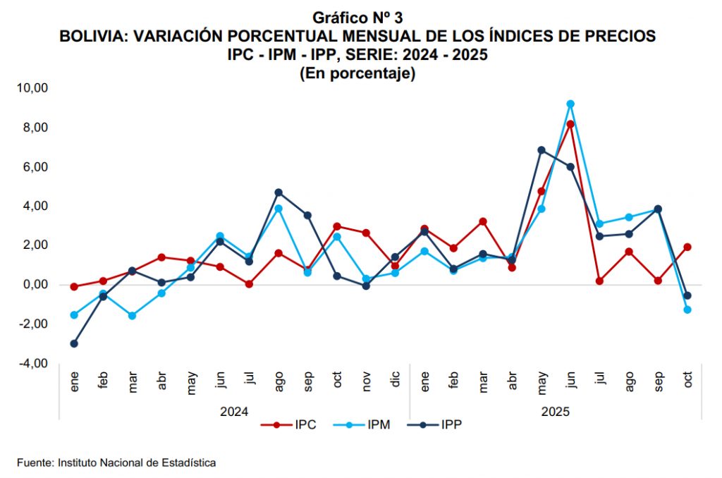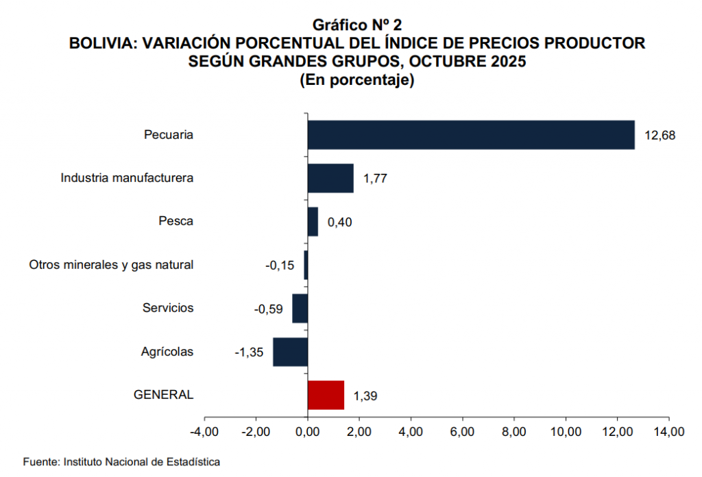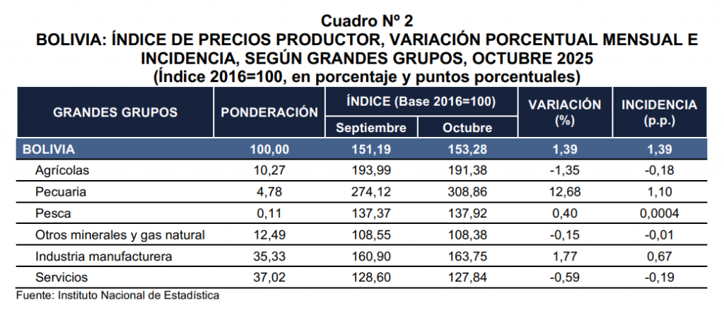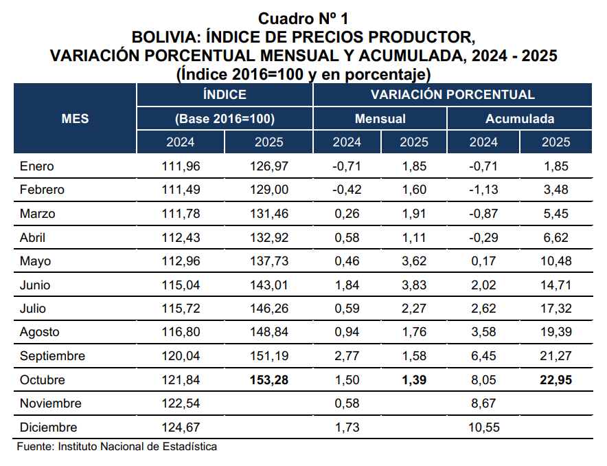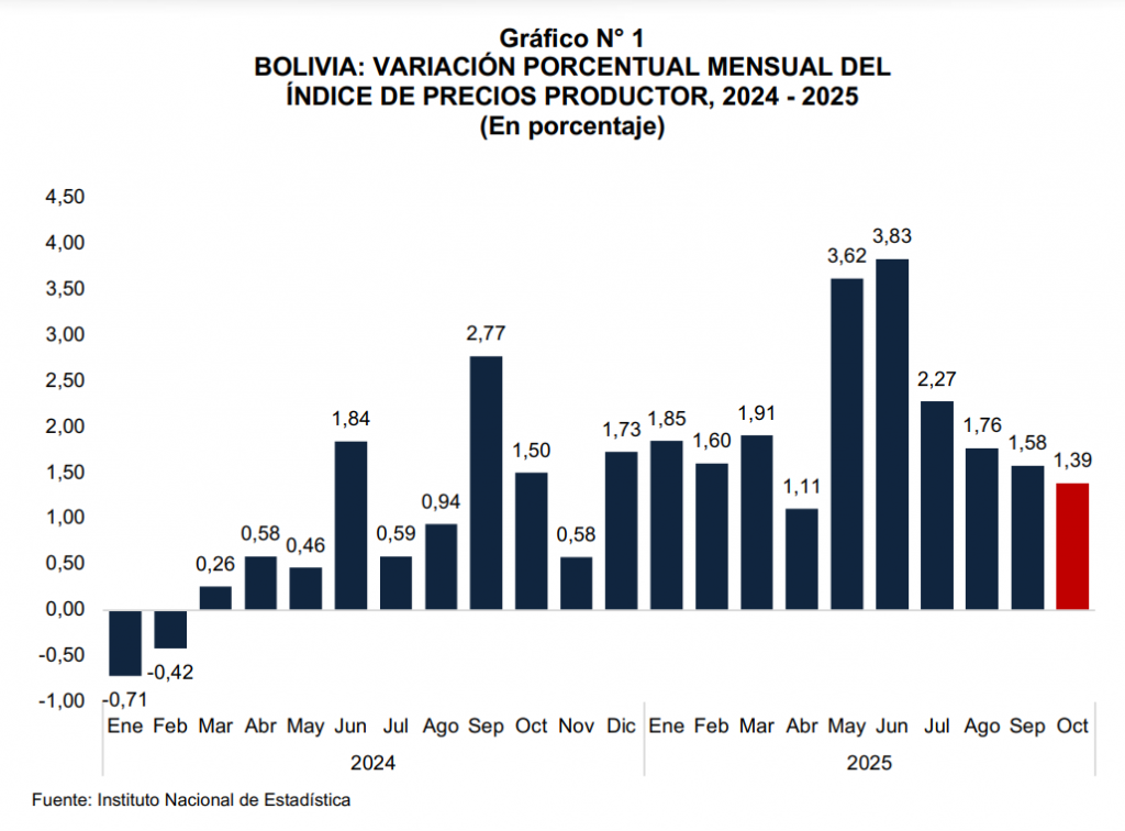 La Paz, 28 de noviembre de 2025 (INE). – En octubre de la presente gestión, el Índice de Precios Productor (IPP) registró un incremento de 1,39% con relación al mes de septiembre y la variación acumulada a octubre fue de 22,95%.
