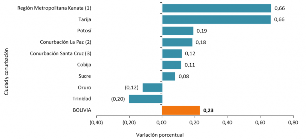 La variación positiva de 0,23% se explica principalmente por la variación porcentual positiva en las siguientes conurbaciones y ciudades capitales: Región Metropolitana Kanata(1) 0,66%; Tarija 0,66%; Potosí 0,19%; Conurbación La Paz(2) 0,18%; Conurbación Santa Cruz(3) 0,12%; Cobija 0,11% y Sucre 0,08%. Por el contrario, las ciudades capitales de Oruro y Trinidad presentaron una variación porcentual negativa de 0,12% y 0,20%, respectivamente.