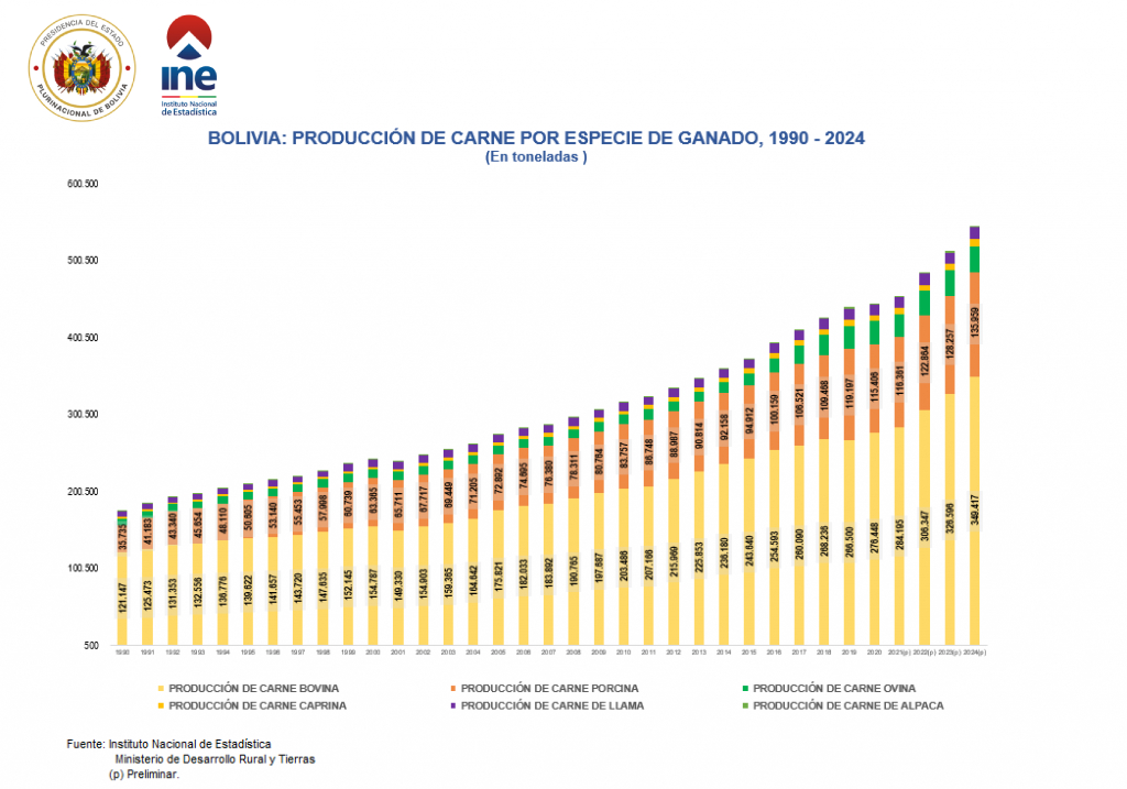 El Instituto Nacional de Estadística pone a su disposición estadísticas de sub productos ganaderas por especie, la producción de carne, constituyéndose como producto de industria alimentaria compuesta con la materia prima de la carne procedente del sacrificio de ganado para el consumo humano de todas las especies; bovino, porcino, ovino, caprino, aves y camélidos.