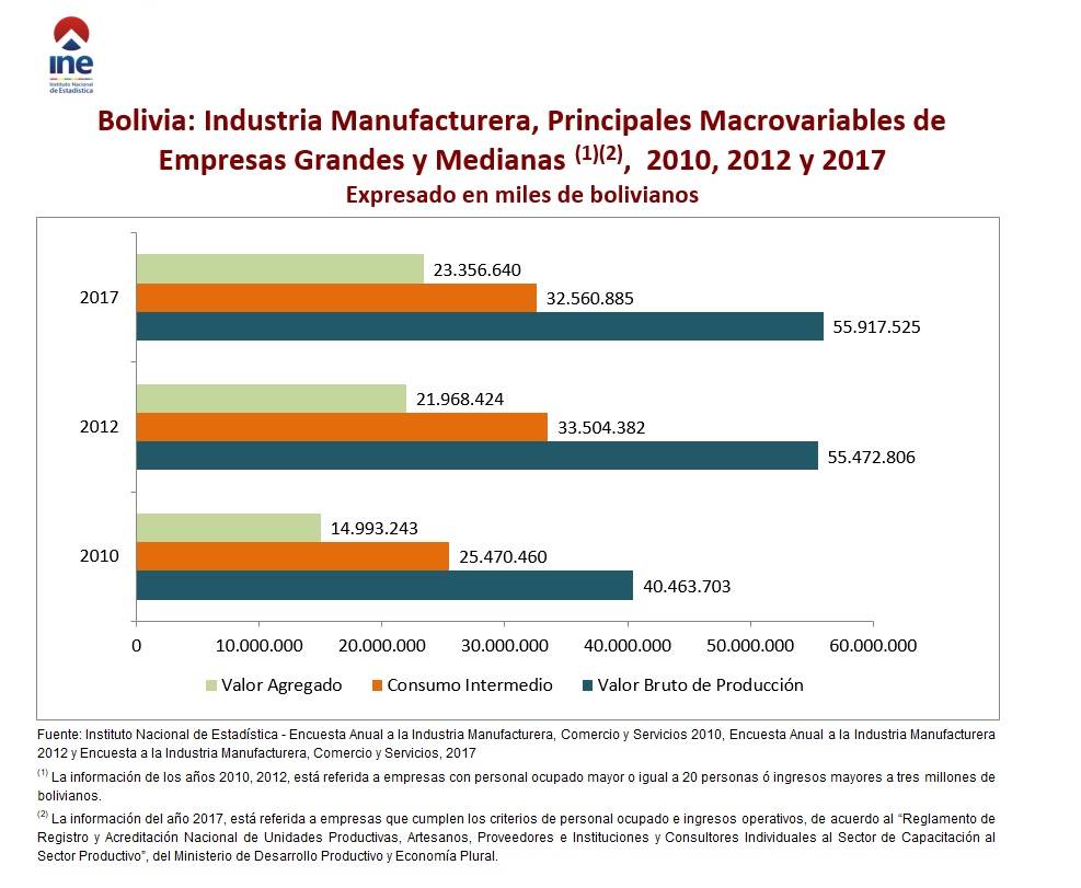 Las estadísticas estructurales de la industria manufacturera, permiten conocer el comportamiento económico del sector industrial a nivel nacional y la conformación de agregados económicos, sirviendo de insumo para el cálculo de las cuentas nacionales. Su fuente de información son las encuestas anuales dirigidas a empresas medianas y grandes, las mismas que el INE ha ejecutado de manera continua hasta el 2001, posterior al 2001, el INE ha recabado información de manera puntual para las gestiones 2004, 2006 – 2007, 2010, 2012 y por último el 2017.