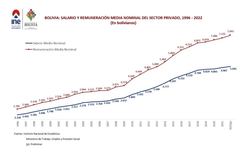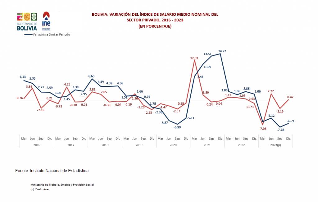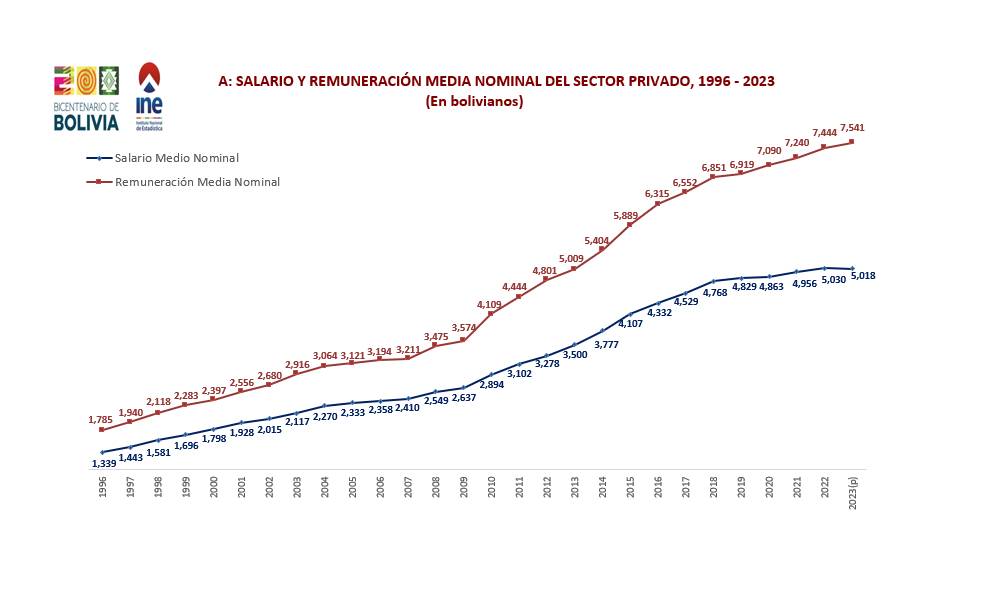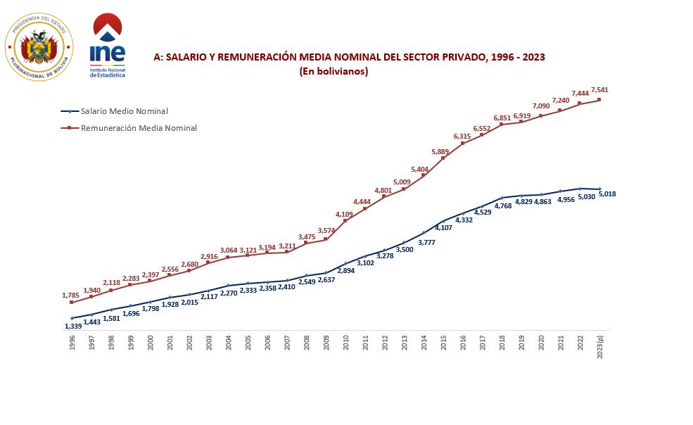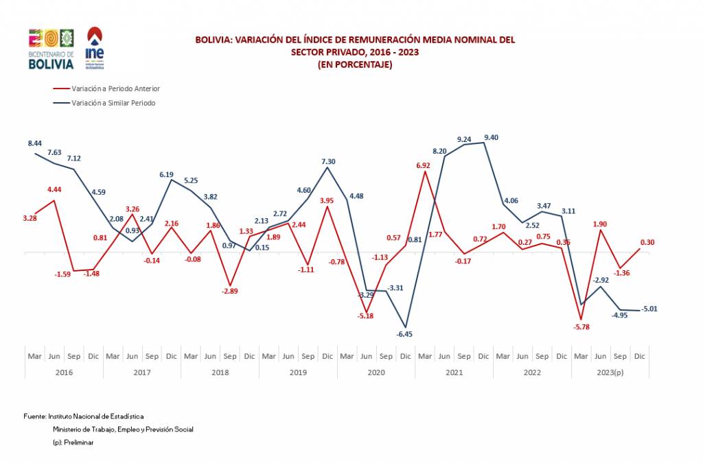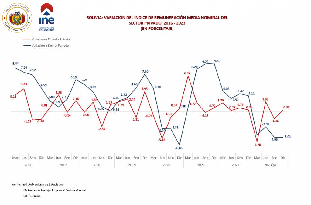 El presente apartado presenta indicadores de Salarios, Remuneraciones y Empleos de los asalariados del Sector Privado cada tres meses, los mismos muestran y miden la variación de estas variables tomando como referencia la observación periódica a un conjunto de empresas representativas del mercado laboral boliviano.