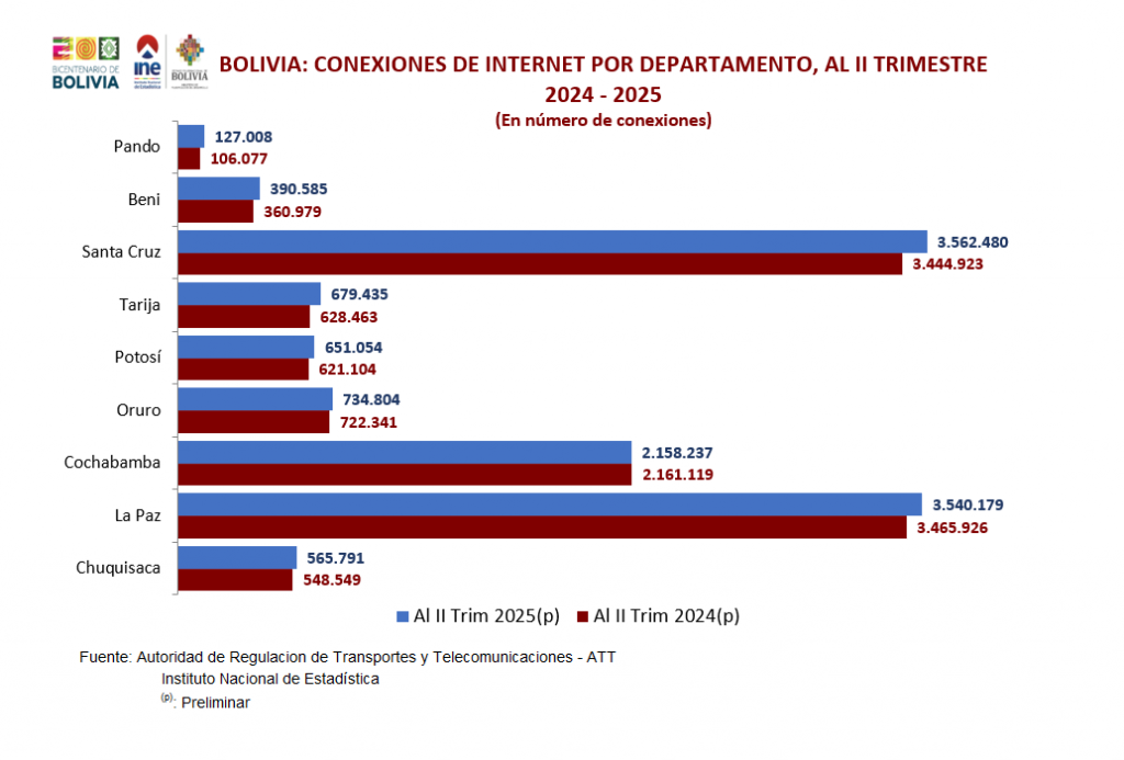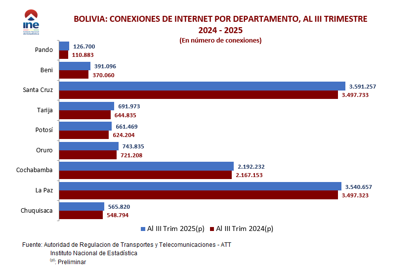 Las estadísticas de telecomunicaciones, permiten conocer el comportamiento económico del sector a nivel nacional y por departamento, sirviendo de insumo para el cálculo de las cuentas nacionales. Su fuente de información son los registros administrativos de la Autoridad de Regulación y Fiscalización de Telecomunicaciones y Transportes ATT.