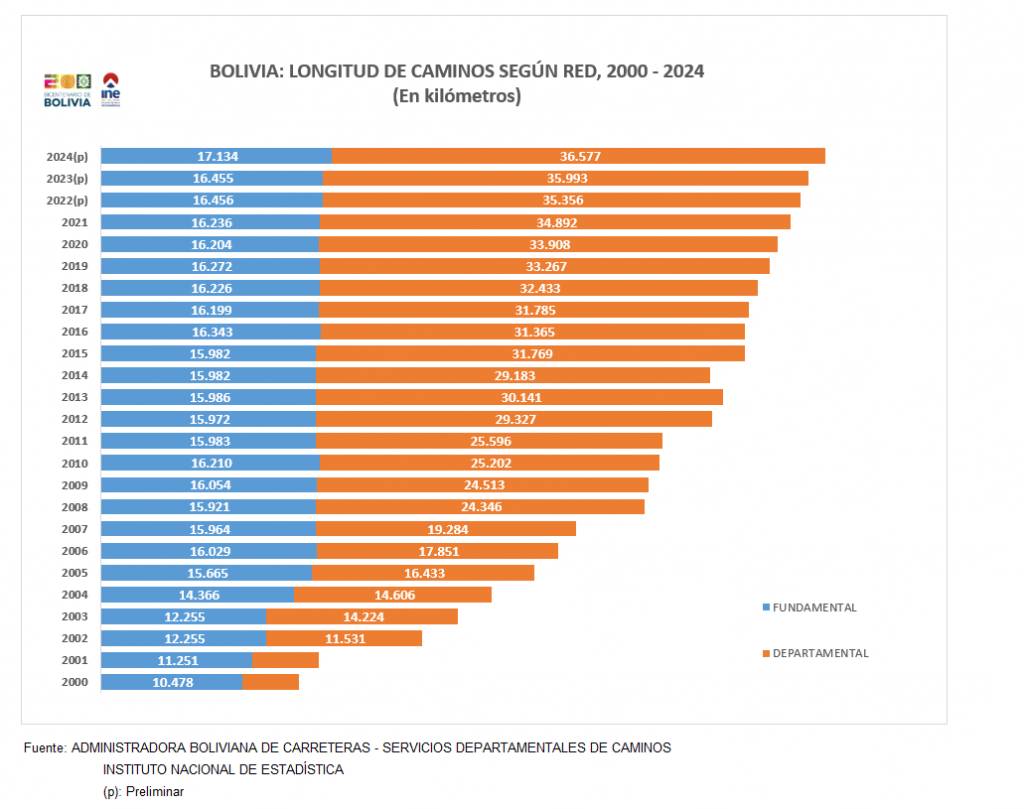 Se consideran estadística básica de longitud de camino a la cuantificación de la longitud de kilómetros construidos y que tuvieron mantenimiento en una gestión, basados en los registros de la Administradora Boliviana de Carreteras, Servicios Departamentales de Caminos.