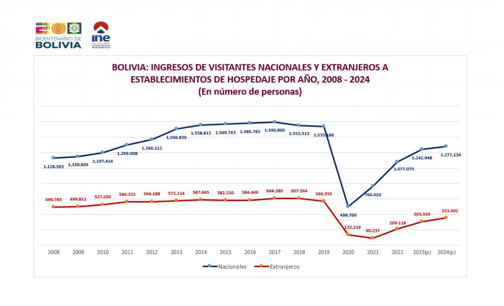 • Bolivia-Ingreso de Visitantes a Establecimientos de Hospedaje Por Año Según Ciudad y Tipo de Visitante, 2008 – 2024