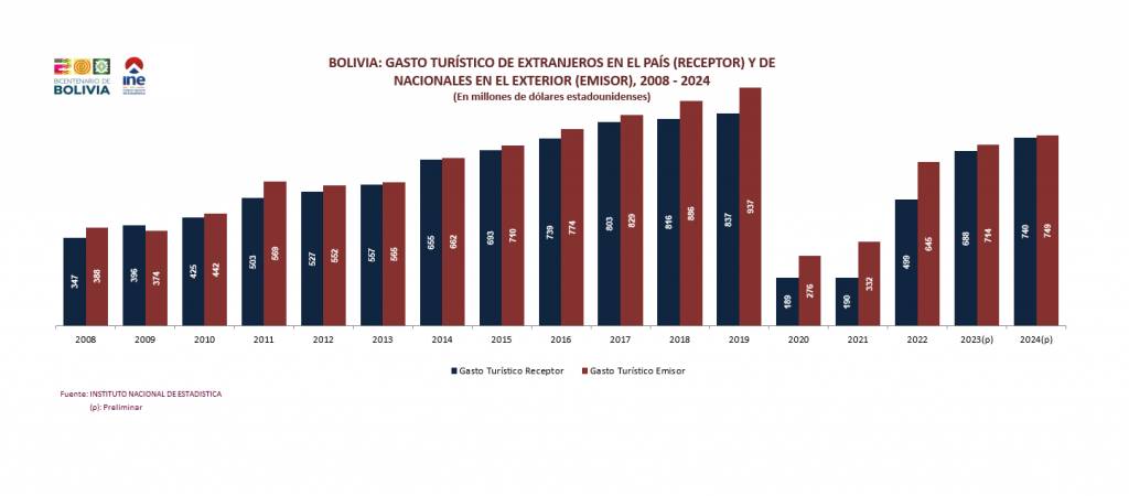- El Gasto Turístico Emisor mide el valor de los bienes y servicios consumidos por los visitantes nacionales durante sus viajes fuera de Bolivia y que se refleja en la salida de divisas por viajes internacionales.