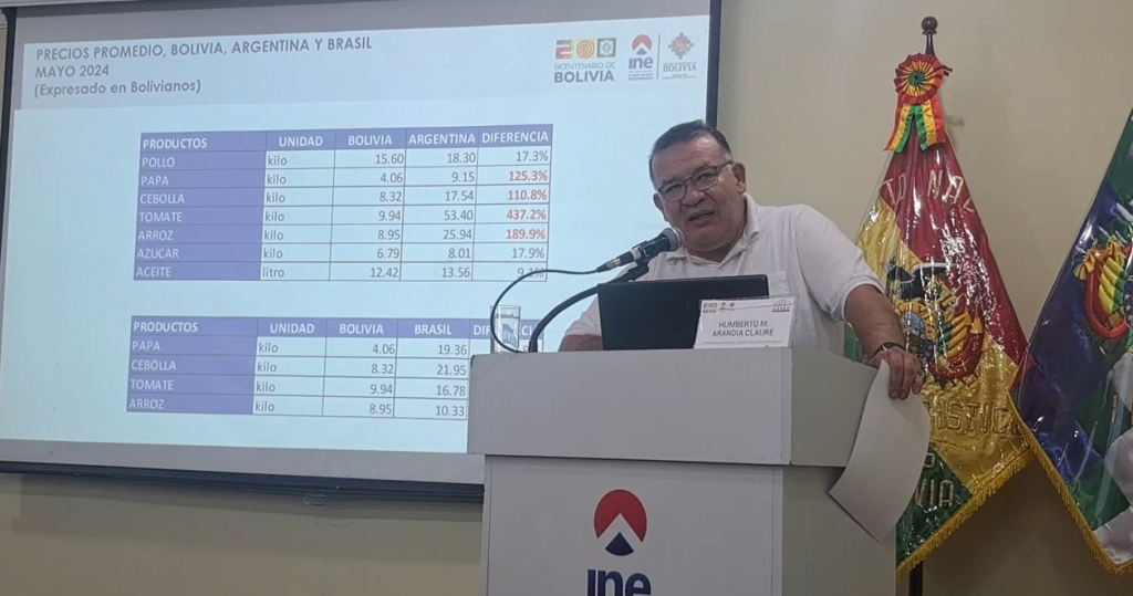La Paz, 08 de junio de 2024 (INE). – El director general ejecutivo del Instituto Nacional de Estadística (INE), Humberto Arandia, explicó en conferencia de prensa este sábado, que el incremento de precio de algunos productos de la canasta familiar en Bolivia está asociado a tres factores principalmente como: fenómenos climatológicos, inflación importada y el contrabando a la inversa.