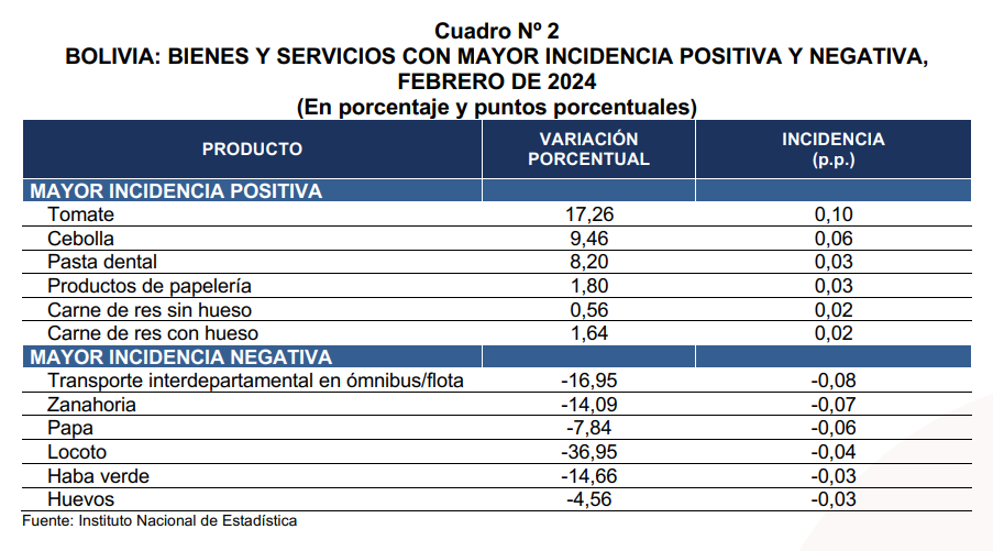 Los productos con mayor incidencia positiva en febrero 2024 fueron: tomate, cebolla, pasta dental, productos de papelería, carne de res sin hueso y carne de res con hueso. Por el contrario, los bienes y servicios con mayor incidencia negativa fueron: transporte interdepartamental en ómnibus/flota, zanahoria, papa, locoto, haba verde y huevos.