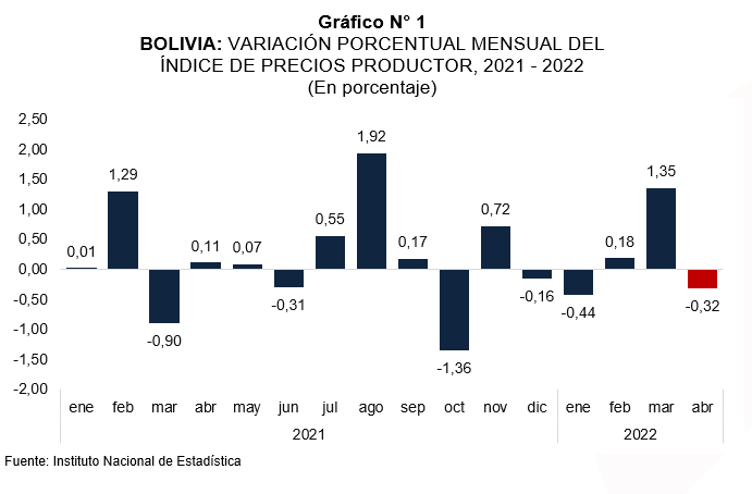 La Paz, 24 de mayo de 2022 (INE). – El Índice de Precios Productor (IPP) [1] registró en abril de 2022 un decremento de -0,32% respecto a marzo. La variación acumulada a abril fue positiva de 0,76% mientras que a doce meses alcanzó 2,36%.