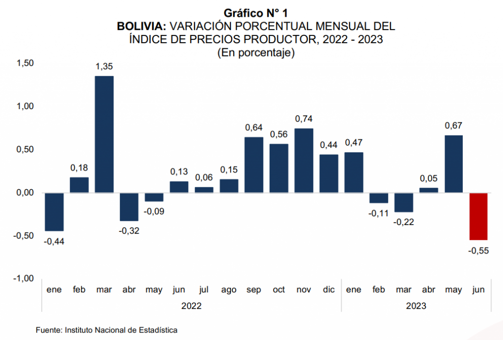 La Paz, 26 de julio de 2023 (INE). – El Índice de Precios Productor (IPP) registró, en junio de 2023, una disminución de -0,55% respecto a mayo y la variación acumulada a junio fue positiva de 0,33%.
