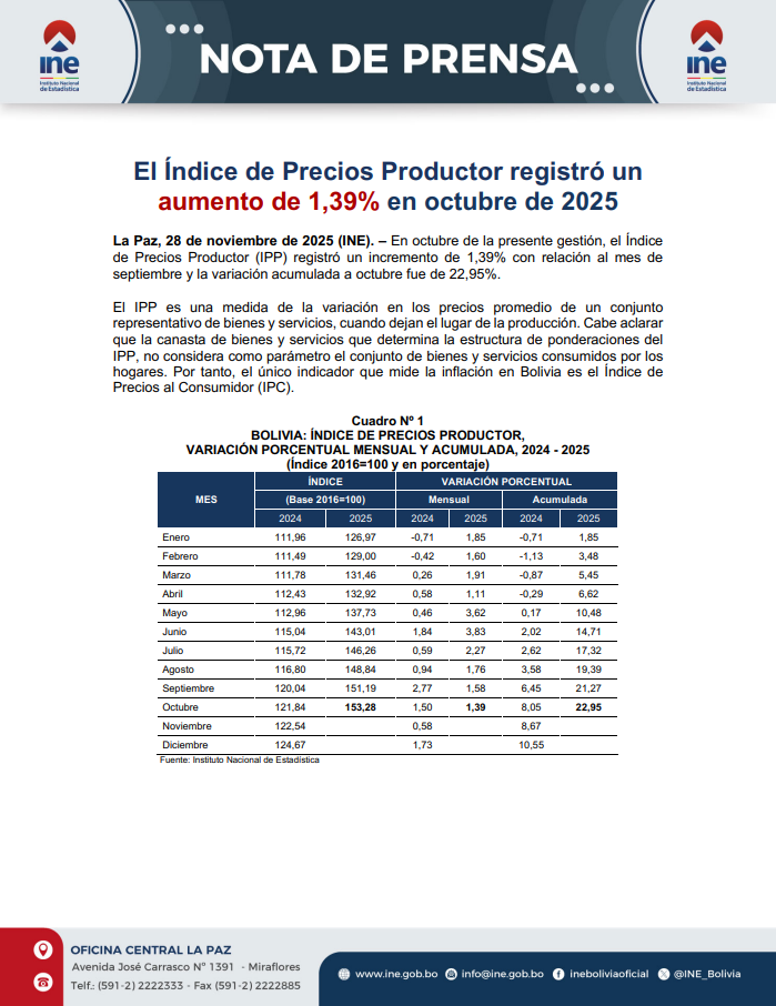 La Paz, 28 de noviembre de 2025 (INE). – En octubre de la presente gestión, el Índice de Precios Productor (IPP) registró un incremento de 1,39% con relación al mes de septiembre y la variación acumulada a octubre fue de...