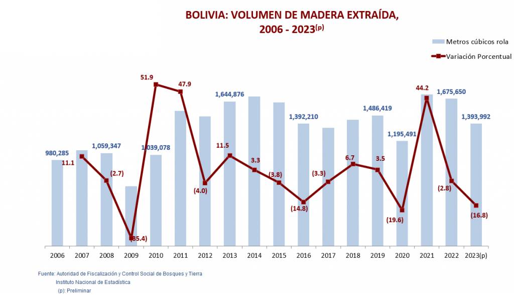 El Instituto Nacional de Estadística pone a su disposición estadísticas de Medio Ambiente en el área temática de recursos forestales, consideradas un conjunto de estadísticas sobre los volúmenes de madera extraída y volúmenes autorizados de productos maderables aprobados para su aprovechamiento a través de los reportes generados y centralizados por la Autoridad de Fiscalización y Control Social de Bosques y Tierra (ABT) del Estado Plurinacional de Bolivia.