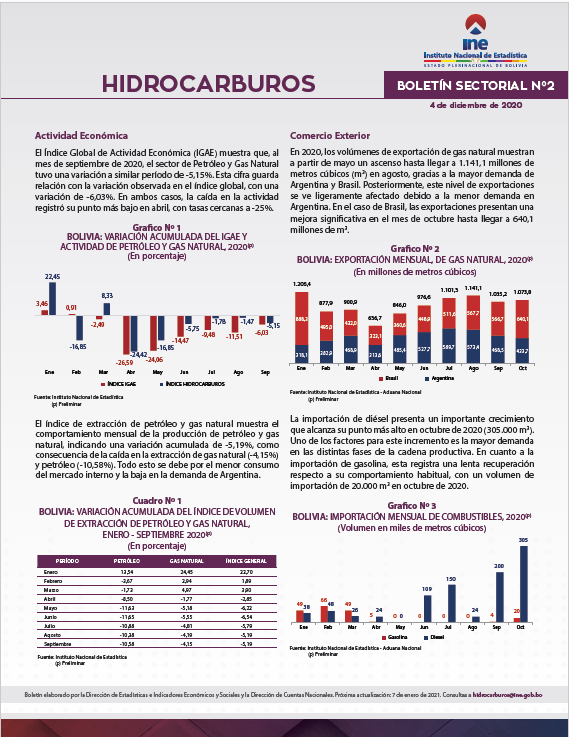 La Paz, 26 de noviembre de 2020 (INE).- Al mes de septiembre de 2020, el Índice Global de la Actividad Económica (IGAE), que representa una estimación a corto plazo de la actividad económica, registra una tasa de variación acumulada negativa de 10,40% con relación a similar periodo de la gestión 2019. Se debe señalar que…