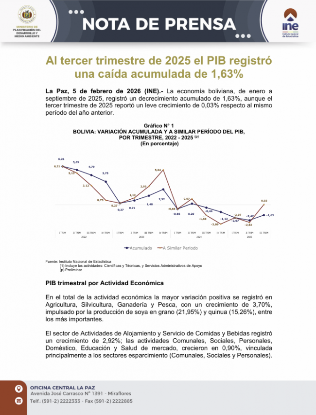 La Paz, 5 de febrero de 2026 (INE).- La economía boliviana, de enero a septiembre de 2025, registró un decrecimiento acumulado de 1,63%, aunque el tercer trimestre de 2025 reportó un leve crecimiento de 0,03% respecto al mismo período del año anterior. PIB trimestral por Actividad Económica En el total de la actividad económica…